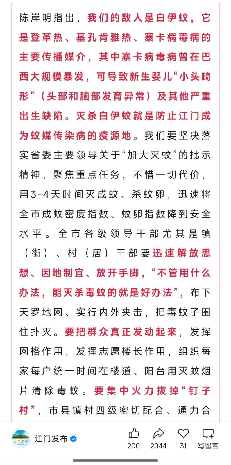 在江门市政府的政务号文章里,可以窥见这场“防蚊战役”的严峻与急迫。