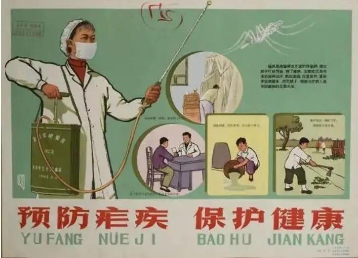 “爱国卫生运动”的说法起源于50年代初朝鲜战争时期,是中美冷战的产物。当时中方宣称美军在朝鲜战场及中国东北地区实施“细菌战”,向境内空投带病菌的苍蝇、跳蚤等媒介昆虫,号召全国开展大规模灭蚊、灭蝇、灭鼠、灭蚤、防疫消杀等群众性行动。自那之后,“爱国卫生运动”逐步制度化:各级政府陆续设立爱国卫生运动委员会,负责统筹环境卫生整治、“除四害”、清污水、垃圾治理、农村改厕、健康宣教等,其特点是:卫生工作与群众相结合,政府领导,群众广泛参与。