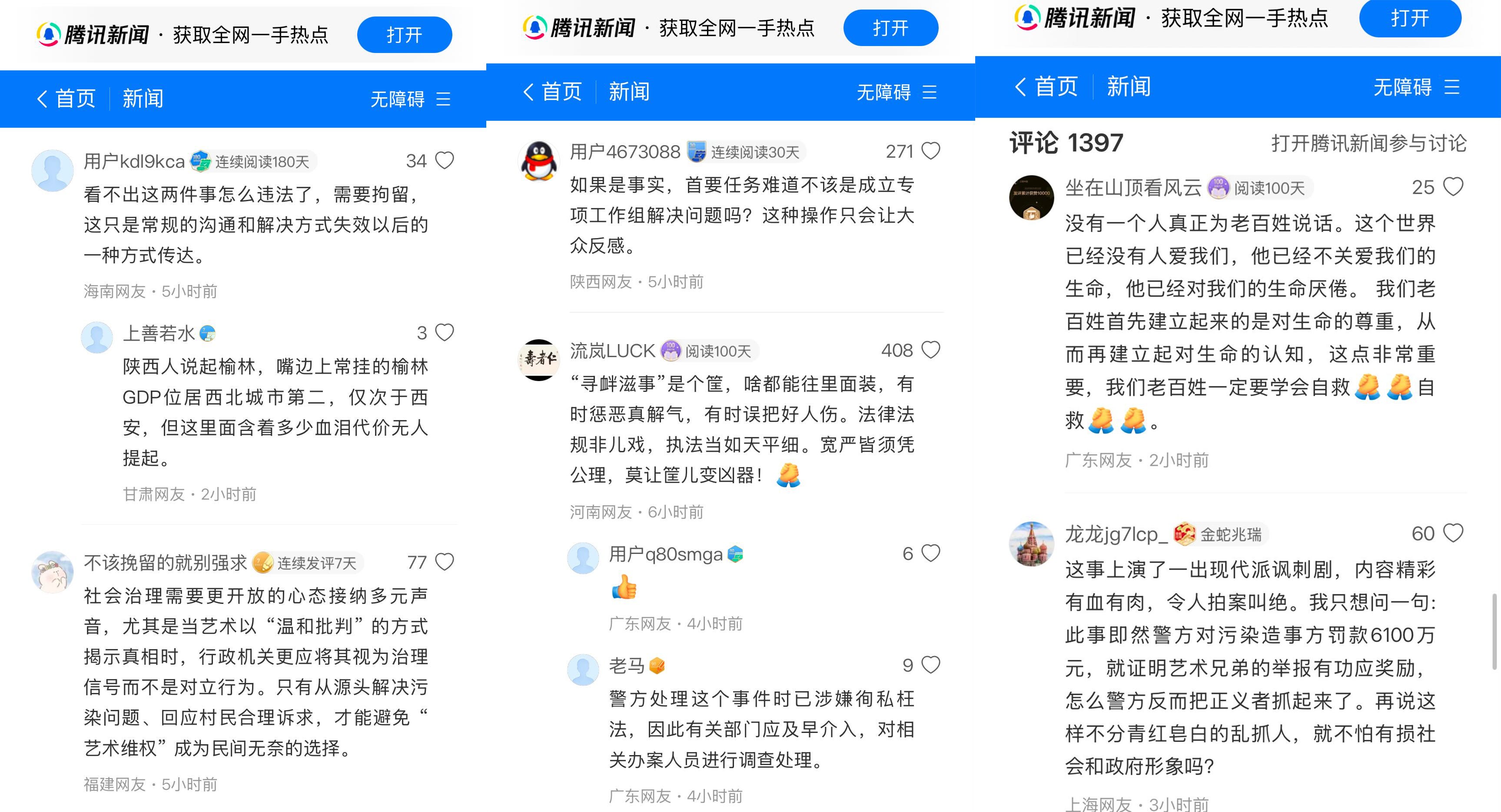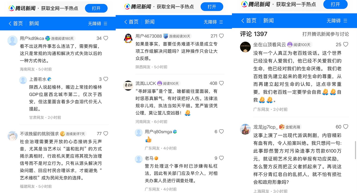 对“艺术即媒体”的方法深信不疑的艺术家,比我们更好地履行了“倾听受害者主观的不正义感”的公民责任,而没有轻易地掉转过头去。与他们站在一起是水瓶纪元坚定不移的选择。虽然长报道未能问世,但“艺术家被行拘”的消息稿得到大量转发,更是短暂地被腾讯新闻加入精选推荐至首页,涌现了大量支持艺术家、质疑地方政府“打击报复”的“活人评论”。每忆及此,我便对身处如此逼仄的媒体环境仍心怀希望。