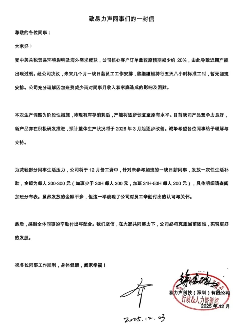 2025年12月3日,易力声发布了一封致员工信。信中称,未来几个月一线员工将继续推行五天八小时标准工时,整体生产状况预计于2026年3月起逐步改善;此外,公司充分理解同事们的困难,12月份工资包含对一线员工的一次性生活补助,(11月)加班31小时至50小时每人200元,加班少于30小时每人300元。